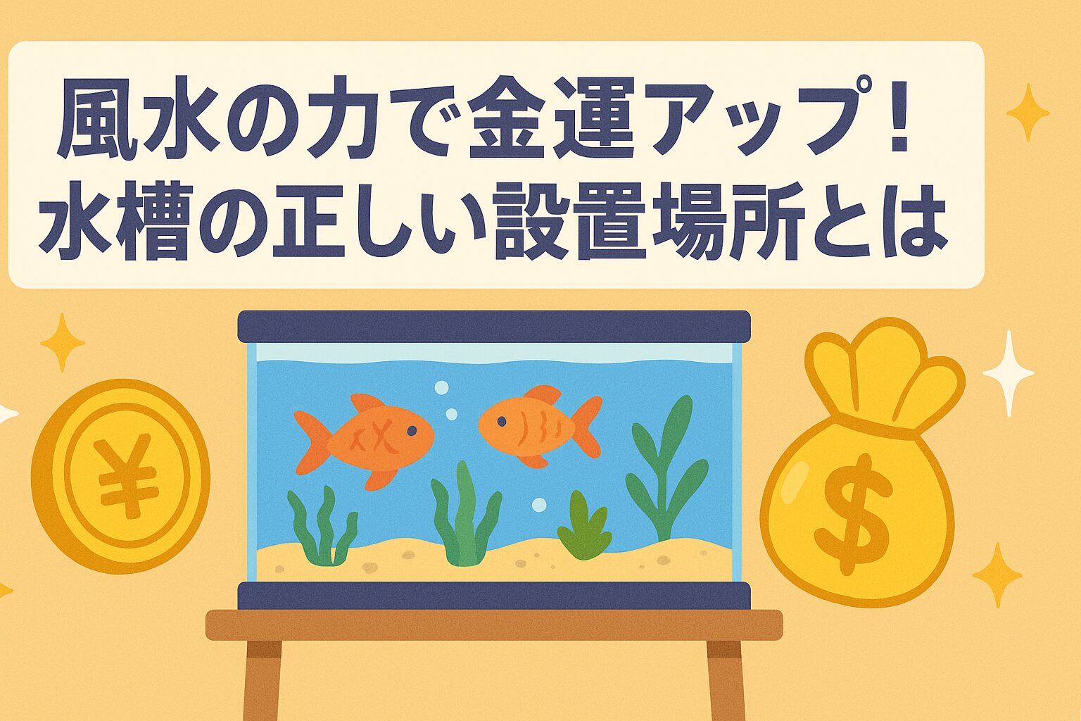 水槽を置くと本当に金運って上がるの?どこから始めればいい? 清潔な水を保てる小さめ水槽を、東~南東の吉方位に。まずは場所と手入れの仕組みを整えるだけで効果は出やすいよ。   どの部屋・方位に ...